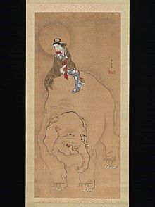 げにげにこれは凡人ならじと 眼を閉ぢて心を静め 見れば不思議や 今まで在りし遊女の姿たちまちに 普賢菩薩と顕じ給ひ